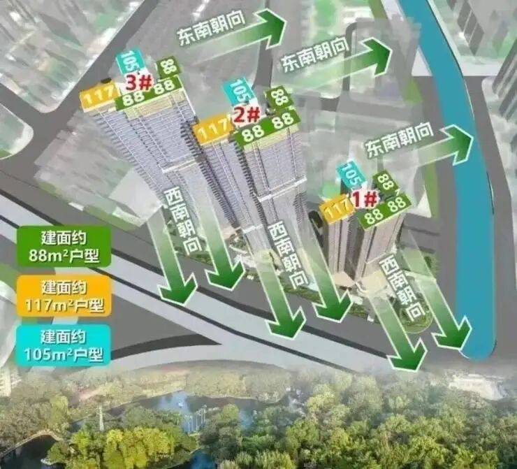 全新3栋已上新,主推建面约88-105-117㎡四房,88平三房共有3条梯腿,有东南向和西南向,105平和117平各有1条梯腿,105为东南,117是西南。