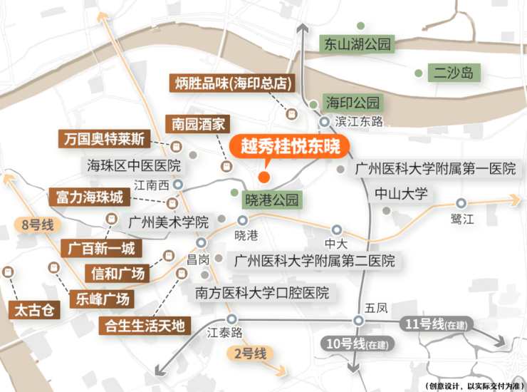 交通配套:距离地铁8号线号线可以直达琶洲、客村等商务圈,一站到昌岗可以换乘2号线,到南站、白云新城也比较方便,三站客村换乘3号线,到珠江新城、体育西路,能实现40min内通勤。